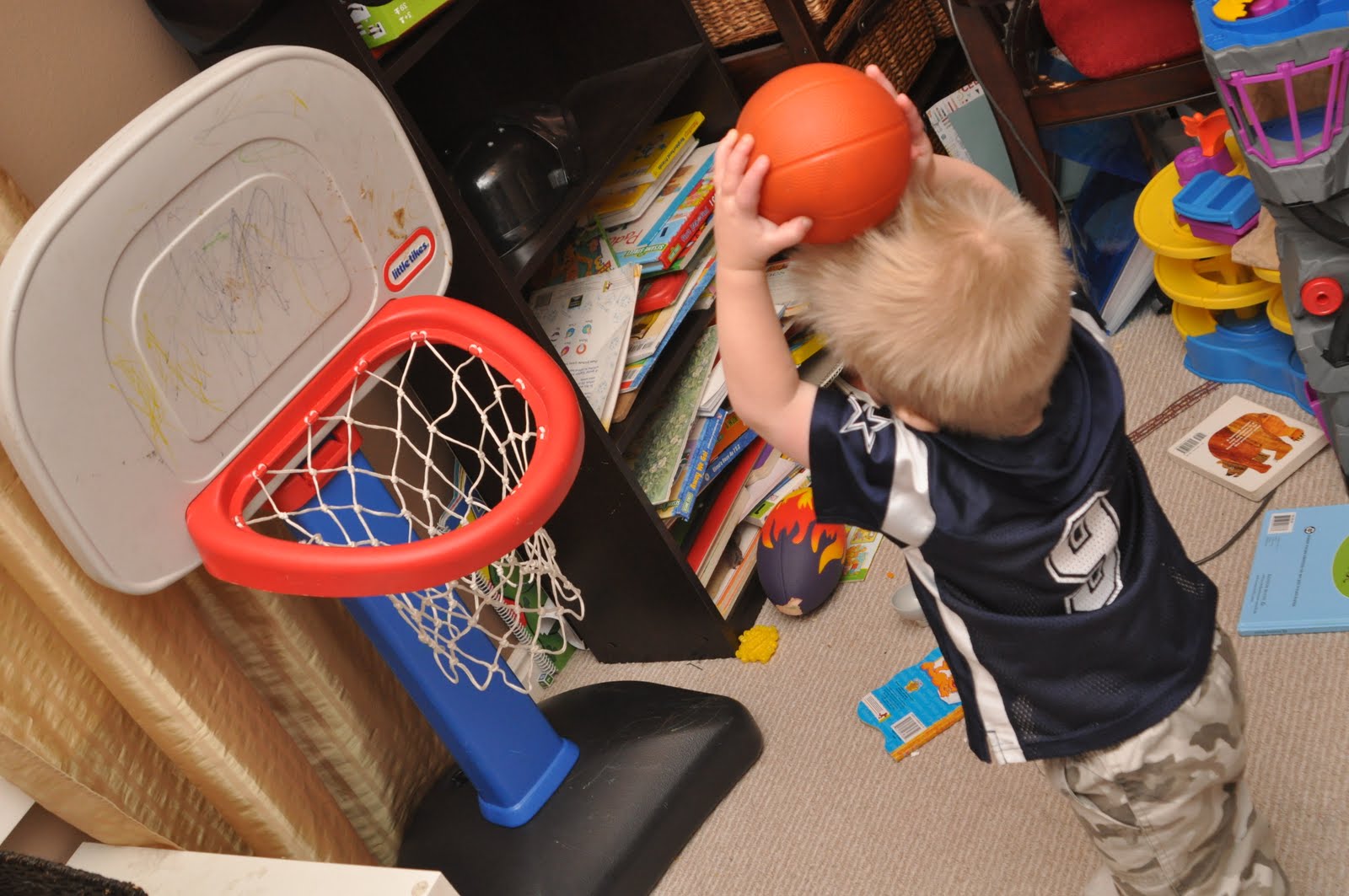Now that Tate is mostly interested in singing and dancing :), we might need to focus on Corey to be our athlete. It is a good thing he is built like a tank and loves anything to do with a ball. (Ignore the messy playroom...)